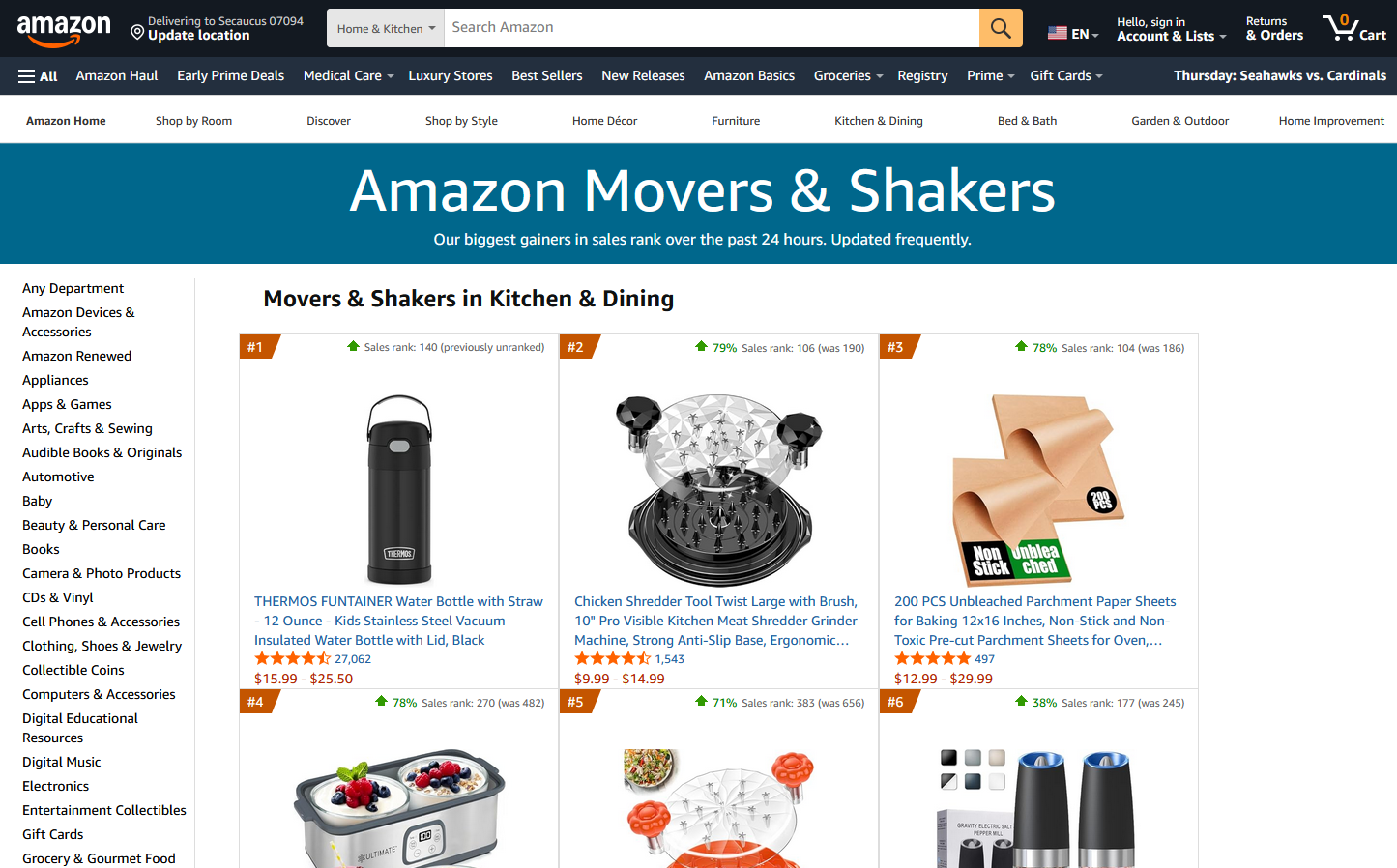 The next stop is Amazon’s Best Sellers and Movers & Shakers lists. These ranks shift quite quickly, and if an item jumps a couple of hundred places in a week, it’s a sure sign of good momentum. It’s a little like taking a sneak peek into millions of shopping carts and spotting the popular Amazon trending dropshipping products before others catch on.