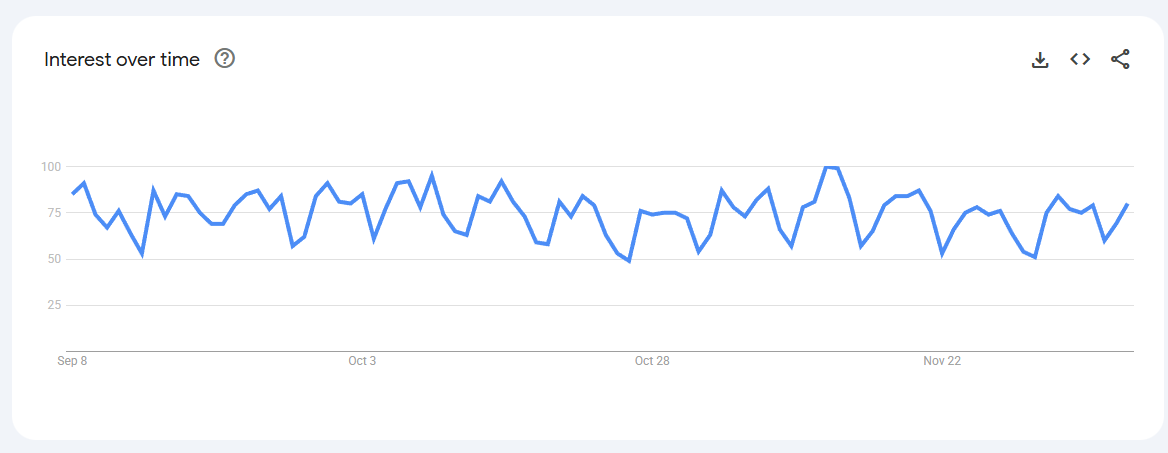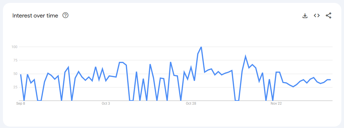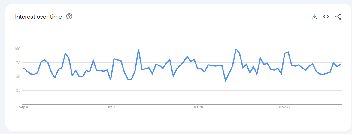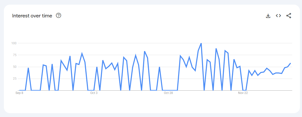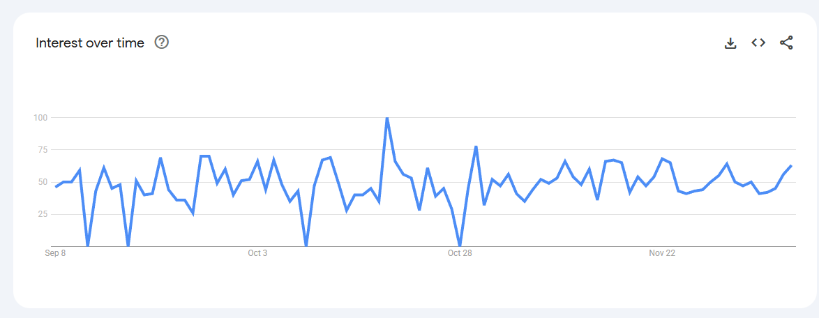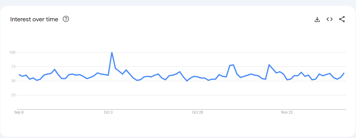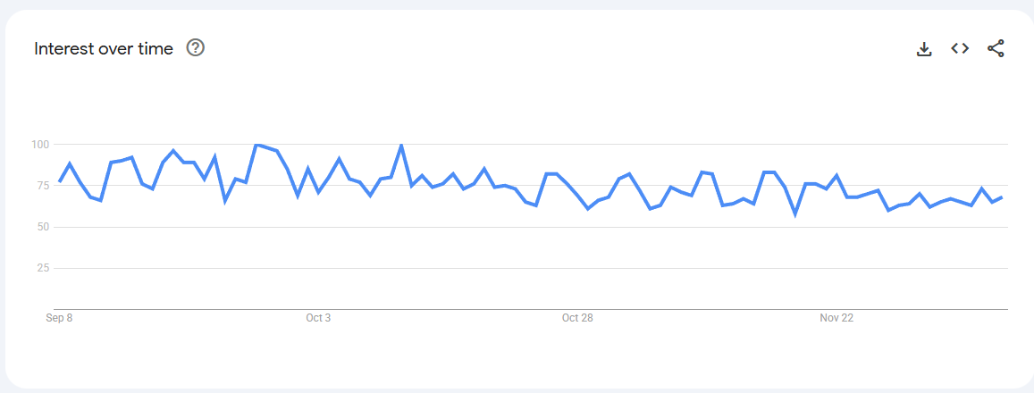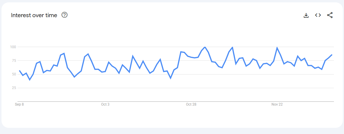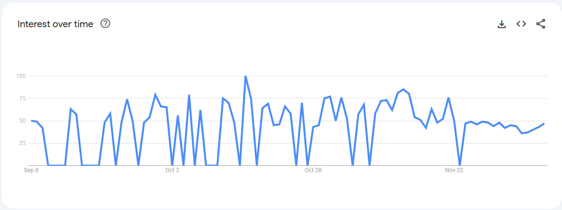 Trend Volatile but recurring spikes (0–80) linked to keto content, weight-management phases, and bulletproof coffee trends.