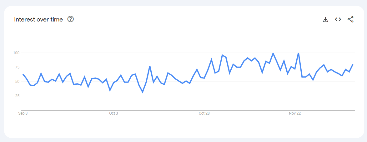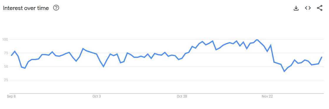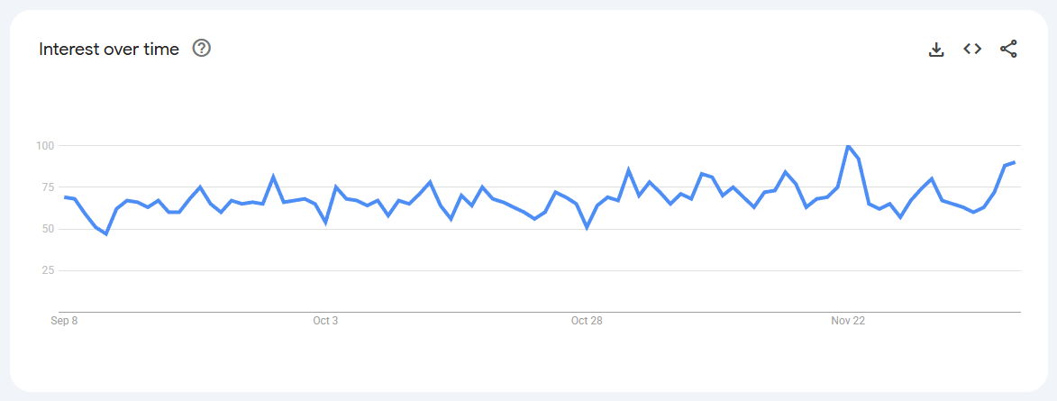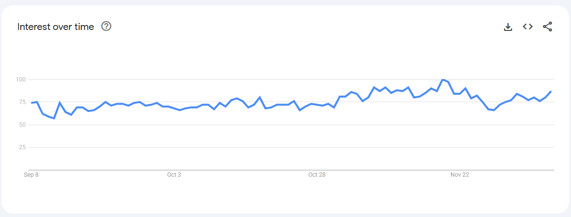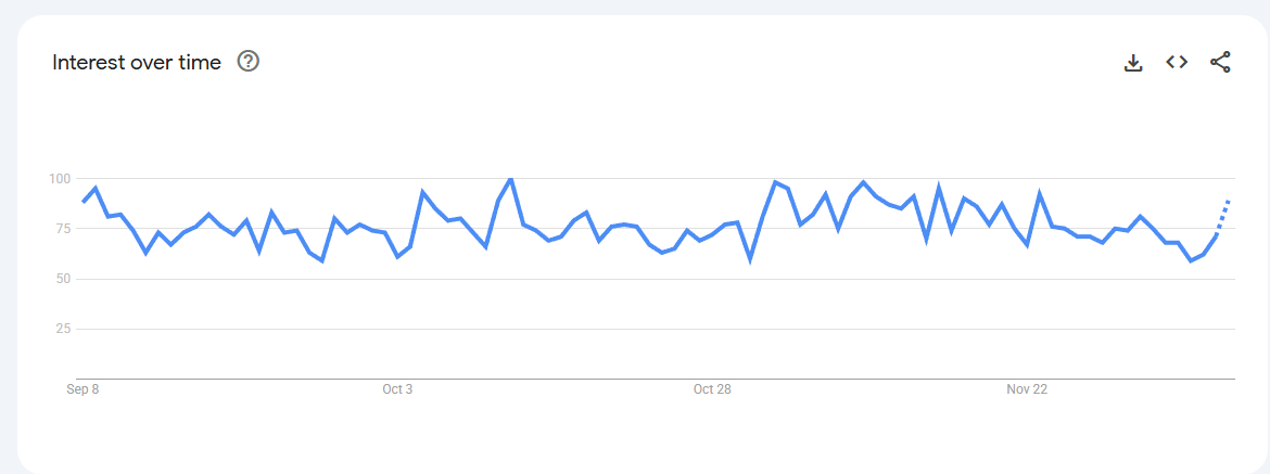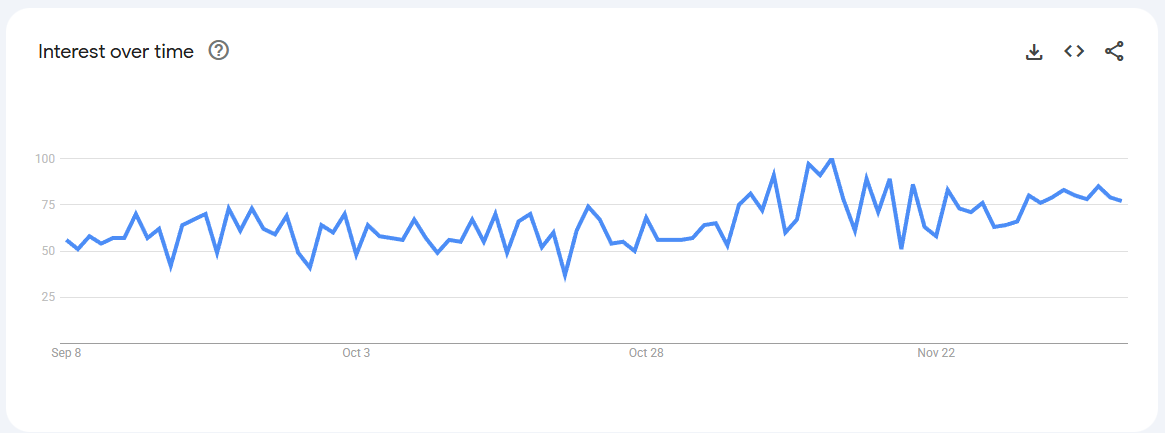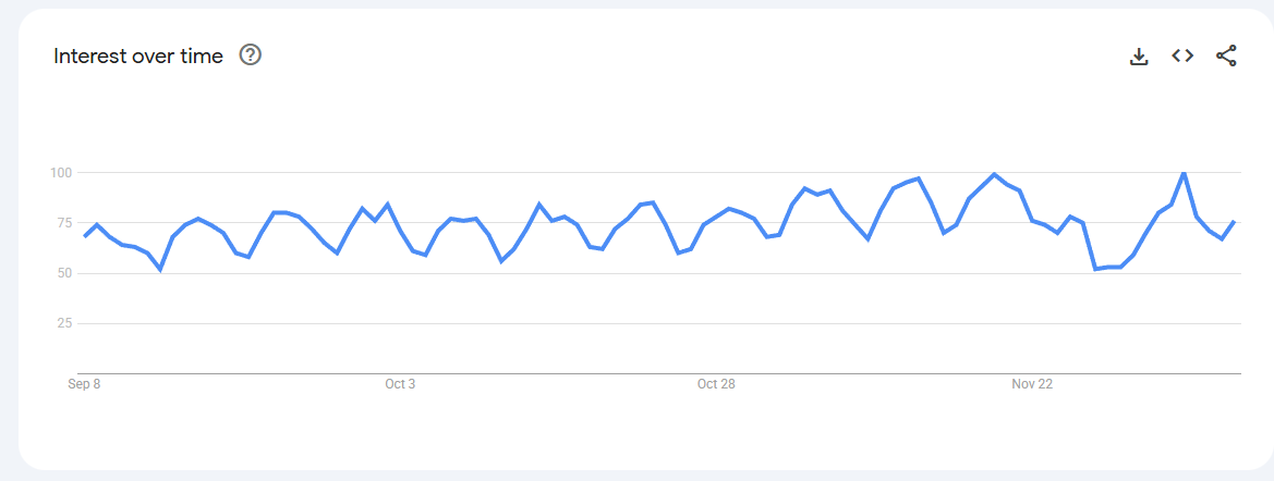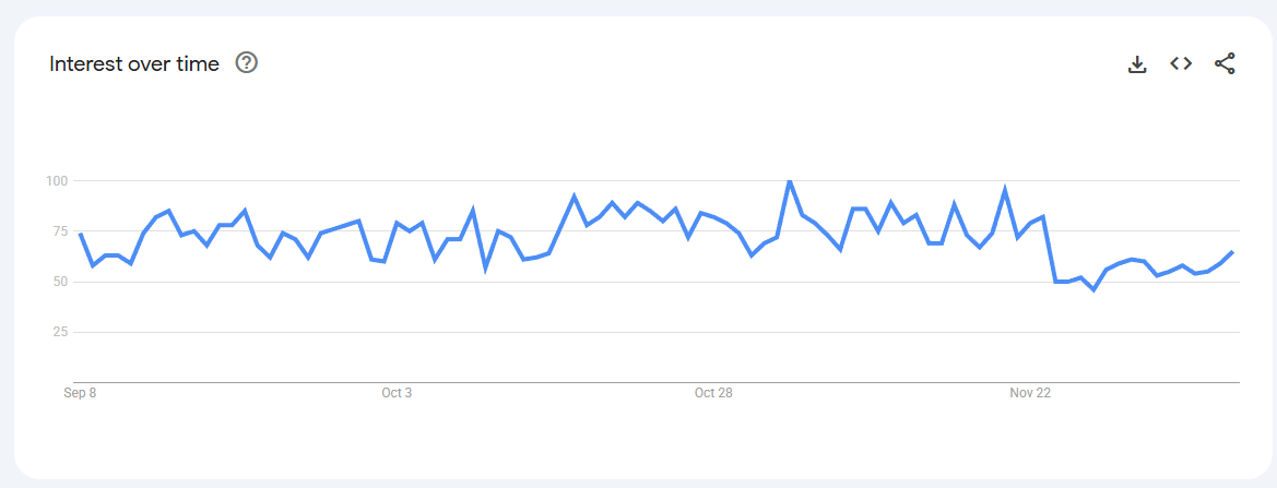 Trend Volatile but recurring spikes (0–80) linked to keto content, weight-management phases, and bulletproof coffee trends.