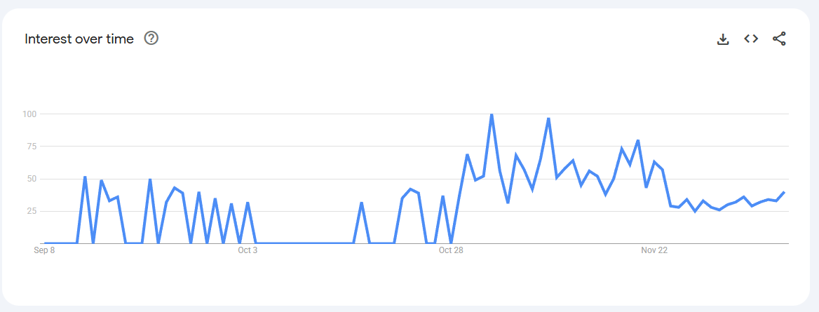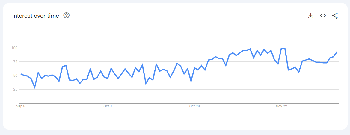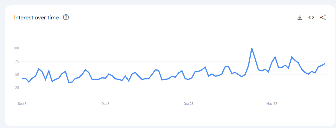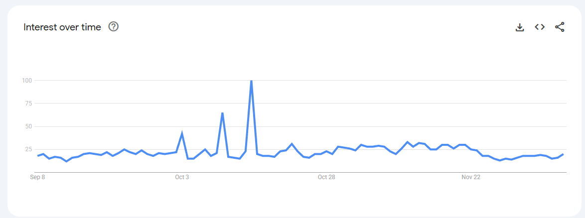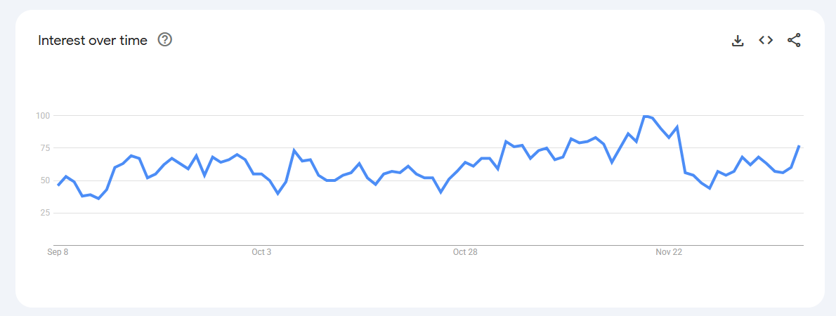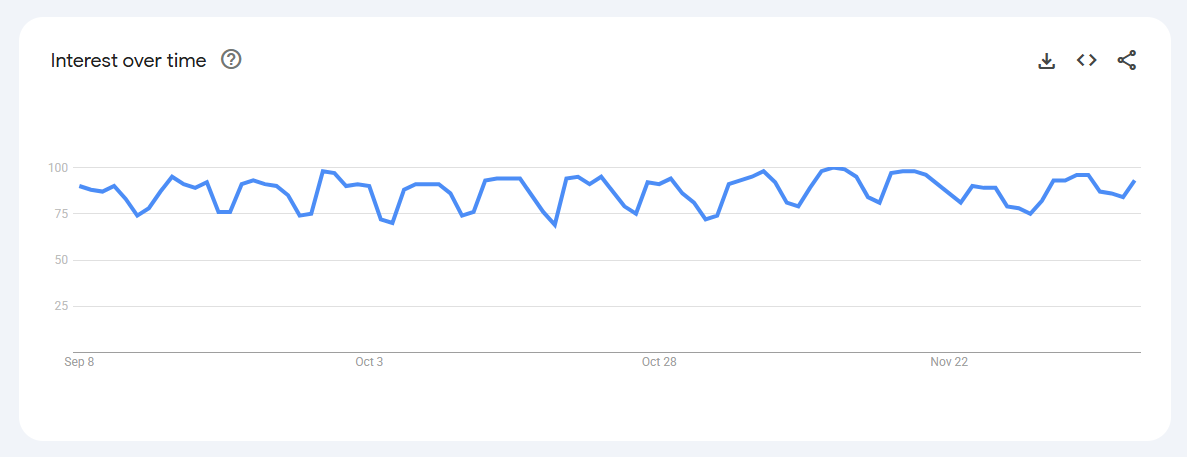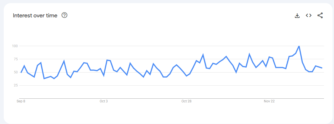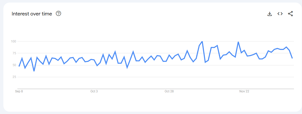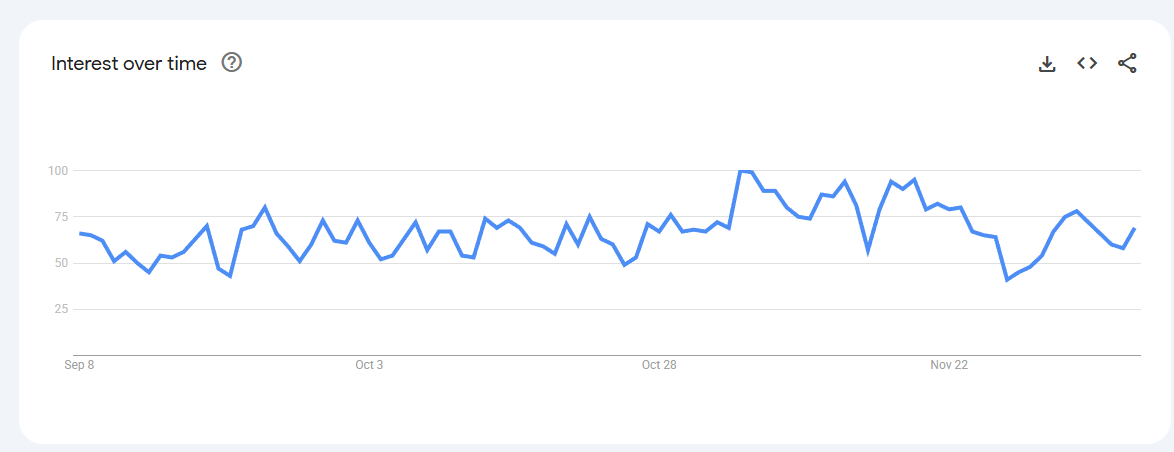 Trend Volatile but recurring spikes (0–80) linked to keto content, weight-management phases, and bulletproof coffee trends.